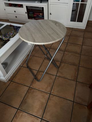 Mesa auxiliar redonda, perfecta para espacios pequeños. Su diseño combina un tablero con acabado de madera y una estructura metálica. - Tablero con veta de madera. - Patas metálicas plegables.