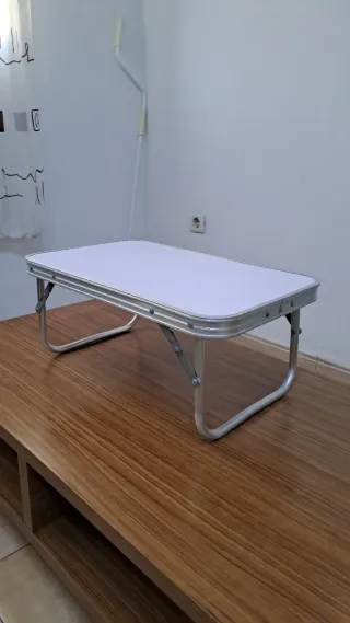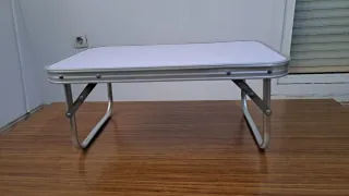 Mesa auxiliar plegable de aluminio con superficie blanca. - Medidas: 56cm de ancho y 34cm de profundidad. 24 cm de alto. - Patas plegables para fácil almacenamiento. - Diseño ligero y portátil. Usada, tiene algo oxidado el metal del pliegue, pero no modifica el funcionamiento.