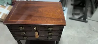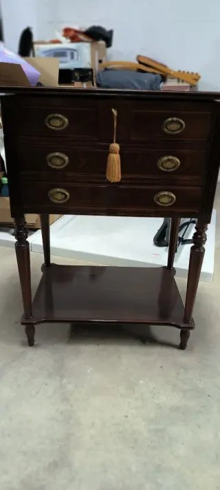 Mesa auxiliar de madera con un diseño clásico y elegante. Se encuentra en buen estado. - Encimera con detalle de marquetería. - Frontal con tres cajones y tiradores metálicos. - Cerradura con llave y borla decorativa.