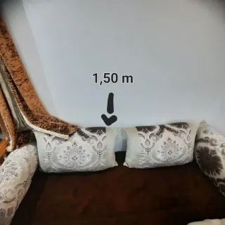 Conjunto de sofá y mesa auxiliar, ambos fabricados en madera de buena calidad. Viene todo incluido los cojines la mesa todo, todo es de buena calidad y de madera no están dañados y duran mucho. Los cojines están como nuevos. - Sofá con cojines decorativos. - Mesa octogonal con mantel. - Medidas del sofá: 1,50 m y 2,00 m. - incluido todo de la foto - de muy buena calidad