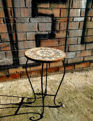 Mesa auxiliar con un bonito diseño de mosaico, perfecta para exteriores. - Tablero circular con detalles de piedra. - Base de metal con un diseño curvo. - venta en persona - NO HAGO ENVÍOS GRACIAS.