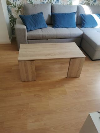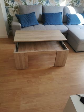 Mesa de centro, se eleva para dar comodidad a la hora de trabajo o comer en color claro con veteado