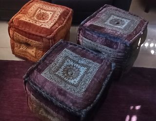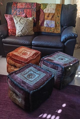 PUF CÚBICO PROCEDENTE DE INDIA. MUY DECORATIVO Y PRÁCTICO. PUEDE USARSE COMO ASIENTO O MESA AUXILIAR. EL PRECIO ES UNITARIO. PAREJA COLOR BERENJENA/VERDE 50€ SÓLO EL NARANJA 28€