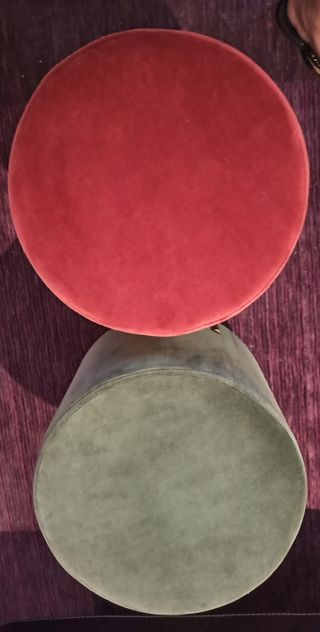 PUFF CILÍNDRICO DE TERCIOPELO CON TRES PATAS DORADAS. MUY ESTÉTICO Y ACTUAL. SE PUEDEN USAR COMO ASIENTO O MESA AUXILIAR. SE VENDEN PREFERIBLEMENTE JUNTOS. EL PRECIO ES UNITARIO.