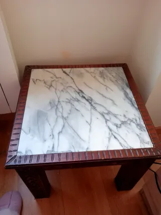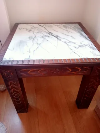 Elegante mesa auxiliar con un diseño único y detalles tallados. - Estructura robusta de madera. - Superficie de marmol - Patas cuadradas con ornamentación. - Borde superior con diseño geométrico. Se enseña en Collado Villalba Precio no negociable, entrega en mano