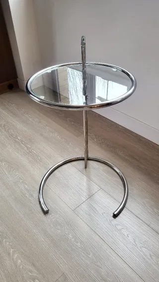 Mesa auxiliar de altura ajustable con un diseño minimalista y elegante, perfecta para complementar cualquier espacio. - Estructura de metal cromado. - Superficie de vidrio. - Altura ajustable. Tiene unas imperfecciones en la base, tal y como se ve en las fotos.