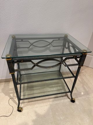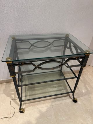 Elegante mesa auxiliar con sobre de cristal y estructura metálica con detalles dorados. Cuenta con dos niveles para mayor capacidad de almacenaje. - Diseño con motivos decorativos. - Ruedas para facilitar su movilidad.