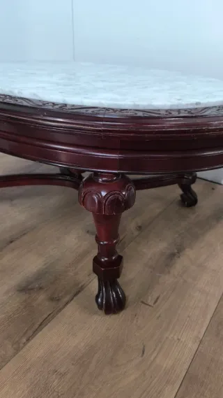 Elegante mesa auxiliar ovalada con tapa de mármol y base de madera.Medidas 1,05 de larga por 44 de altura y 70 de ancha más mesas y cosas en mi perfil - Diseño ovalado. - Patas talladas con detalle. - Estructura robusta.