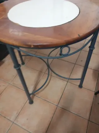 Mesa auxiliar con un diseño elegante y funcional. - Tablero redondo de madera con centro desmntable - Base de forja con detalles decorativos. - Patas metálicas estables.
