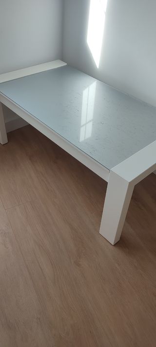 Se compró hace unos meses por 50€ y se vende por mudanza. Tiene un desperfecto en una esquina por un golpe de la agencia de transporte, por eso el precio. Mesa auxiliar de diseño moderno con acabado liso. - Patas robustas para mayor estabilidad. - Esquinas protegidas con protectores transparentes.