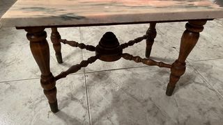 Elegante mesa auxiliar con un diseño único. - Tablero de mármol con veteado en tonos rosas y negros. - Patas de madera con un diseño clásico.