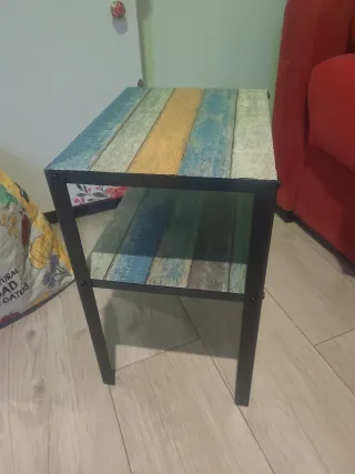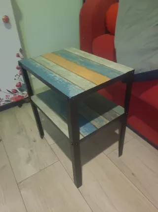 Mesa auxiliar con un diseño moderno y original. - Estructura de metal. - Tableros de madera con acabado multicolor. El papel se puede quitar y queda como nueva