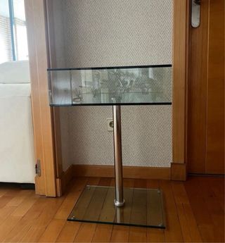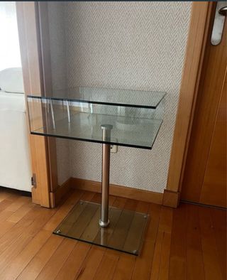Elegante mesa auxiliar con un diseño moderno y minimalista. La compré en el corte ingles por 180€. En perfecto estado. - Superficie de cristal. - Base y soporte de metal. - Dos niveles para colocar objetos. Medidas 45x45 cm y 68cm de alto.
