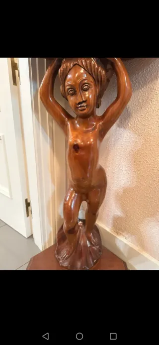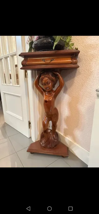 Mesita auxiliar de madera con un diseño único. - Figura de niño tallada que soporta la mesa. - Forma esquinera. - Cajón con tirador. Medidas 87x42