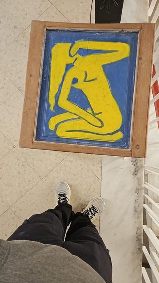 Mesa auxiliar con un diseño llamativo y original. - Marco de madera. - Ilustración central en tonos azul y amarillo. -Pintada a mano