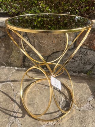 Elegante mesa auxiliar con sobre de cristal y base metálica dorada. - Diseño moderno y ligero. - Base circular con soporte central. - Sobre de cristal transparente.