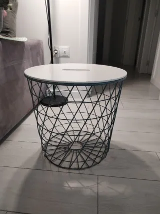 Mesa auxiliar con un diseño rústico y original. Se abre, dentro de puede guardar menaje de mesa o cualquier otra cosa. La tapa hay que lijarla, es madera natural. - Tapa de madera con acabado desgastado. - Cuerpo metálico con detalles blancos. - Patas negras - Altura 50cm - Diámetro 60cm Todos los artículos que estoy vendiendo están bien cuidados y listos para su próxima aventura contigo 😊 Es importante darles una segunda oportunidad y aprovechar al máximo lo que ya tenemos 🍀