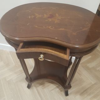 Elegante mesita auxiliar redonda con un práctico cajón. -Patas con base triangular - Diseño clásico y funcional. - Acabado en tono madera oscura.. - Tiene algún toque para arreglar. Pero de estructura está bien. - Aquí no hago envíos.