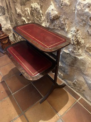 Elegante mesa auxiliar de estilo vintage con dos niveles. Medidas alto 61 cm ancho 53 cm fondo 27 cm parte superior 47 parte inferior . - Acabado en madera oscura. - Superficies con detalles en cuero rojo y borde dorado.