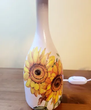 Lámpara auxiliar decorada con un bonito diseño de girasoles. Realizada con material reciclado - Base con acabado mate. - Pantalla de tela texturizada.