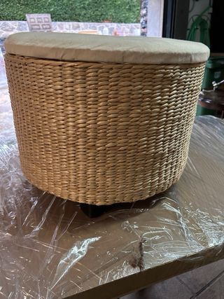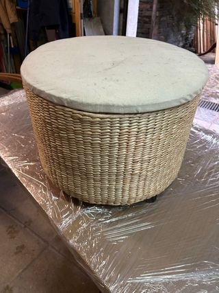 Mesita auxiliar redonda con un diseño tejido. Con almacenaje y patas medidas alto 34 cm diametro 44 cm la tela de la tapa habria que limpiar . - Estructura de mimbre. - Tapa tapizada en tela.