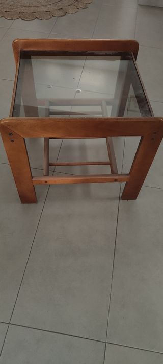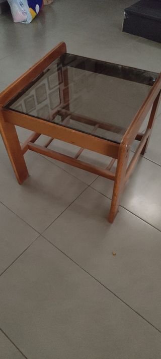 Mesa de madera y cristal para cualquier uso, tiene una balda también de cristal a media altura.