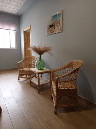 Conjunto de mobiliario de exterior o interior, ideal para crear un rincón acogedor. - 2 Sillones individuales de mimbre con diseño curvo. - 1 Sillón doble de mimbre con diseño curvo. - Mesa auxiliar a juego. - Materiales naturales.