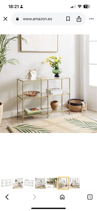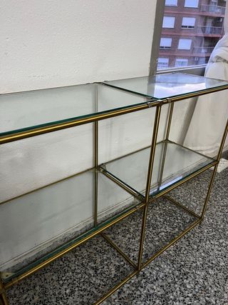 Elegante mesa auxiliar con estructura metálica en tono dorado y superficie de cristal. - Diseño moderno y versátil. - Combina a la perfección con diversos estilos de decoración. - Ideal como mesa de apoyo o expositor. (negociable)
