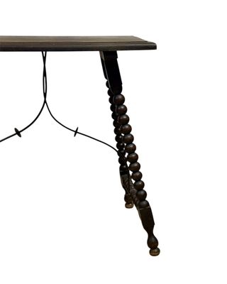 Mesa auxiliar española Circa 1.880. Mesa auxiliar española Circa 1.880, realizada en madera ebonizada, con patas torneadas bobinadas y fiadores de hierro forjado. Influencia renacentista/barroca popular, muy usada en casas señoriales y rurales. Medidas: Alto 69cm Ancho 68cm Fondo 49cm Este producto puede tener algunos desgastes, marcas y patina acorde a su antigüedad.