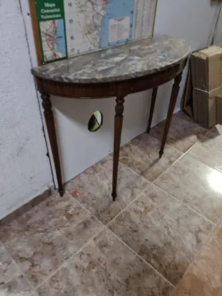 Elegante mesa auxiliar con tapa de mármol y estructura de madera. - Diseño semicircular. - Patas finas y estilizadas.