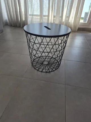 Mesa auxiliar de diseño moderno con un práctico espacio de almacenaje. - Tapa redonda. - Base de alambre. - Acabado en blanco. Combina tapa blanca con estructura metálica tipo cesta para guardar mantas, cojines etc. Muy ligera y decorativa. En perfecto estado. Lista para usar.
