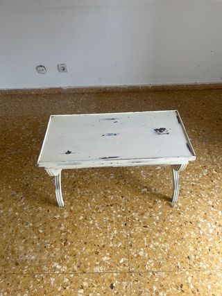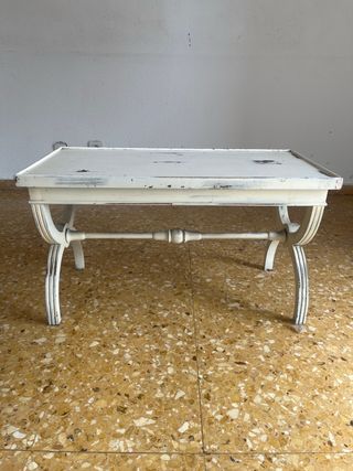 Mesita auxiliar con un diseño encantador y un acabado desgastado que le da un toque vintage. Perfecta para añadir un elemento decorativo a cualquier rincón. - Patas curvas y elegantes. - Superficie rectangular con bordes definidos.