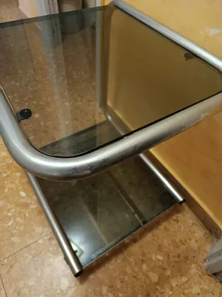 Mesa auxiliar con superficie de cristal y estructura metálica. - Diseño moderno y funcional. - Patas con ruedas para fácil movilidad.