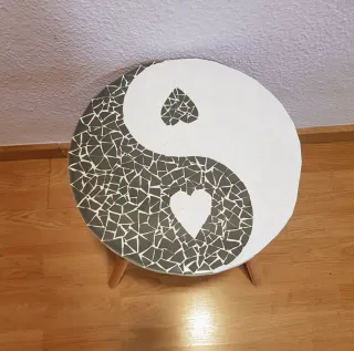 Original mesa auxiliar redonda con diseño unico de mosaico. - Superficie de mosaico en tonos blanco y gris. - Patas de madera. - Medidas: 46 cms de altura. 42 cms de diametro.