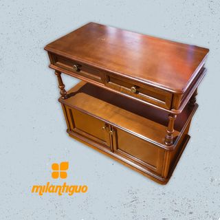 Mesa auxiliar de madera con un diseño elegante y práctico. - Dos cajones frontales. - Estante inferior. - Patas torneadas decorativas. Medidas de : 86 cm de largo / fondo de 45 cm / alto de 80 cm. Recoger en Valladolid barrio delicias a pie de calle.