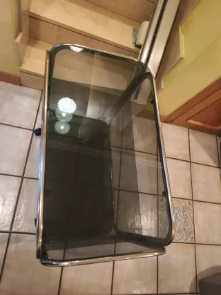 Elegante mesa auxiliar con dos estantes de cristal y estructura metálica. He sacado foto de la parte de arriba porque en una lo plateado está algo rozado