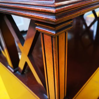 Elegante mesa auxiliar de madera con detalles en latón y ruedas. - Diseño clásico con dos cajones. - Estantes inferiores para almacenamiento. - Patas con ruedas para fácil movilidad. - Adornos laterales en latón.