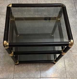 Elegante mesita auxiliar con un diseño moderno y funcional. - Estructura metálica con acabado dorado. - Superficies de cristal. - Dos niveles para almacenamiento.