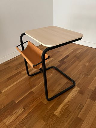 Mesa auxiliar con un diseño moderno y funcional. - Tablero de madera con bordes redondeados. - Estructura de metal negro. - Práctico bolsillo lateral de cuero marrón.
