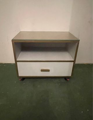 Mesa auxiliar moderna con un diseño elegante y práctico. Con un cajon. - Base de cristal transparente. - Estructura de madera. - Ruedas para fácil movilidad.