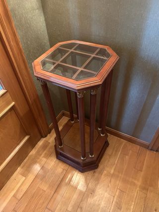 Elegante mesa auxiliar con diseño octogonal. - Encimera de cristal con divisiones. - Patas de madera con detalles dorados. - Base octogonal de madera.Tamaño 38 cm ancho y 87 cm de alto