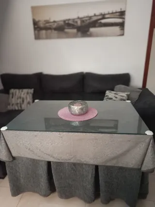 Elegante mesa camilla con superficie de cristal y falda de tela. - Tapete a estrenar Si no lo necesitas 12 euros menos en el precio - Diseño moderno y funcional. - Combina cristal transparente con detalles en tela gris. - Ideal para dar un toque acogedor a tu salón. Se entrega desmontada , se vende por cambio de mobiliario.