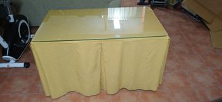 Mesa camilla con cristal ,ropa y mantel - Estructura de madera. - Ropa de tela.