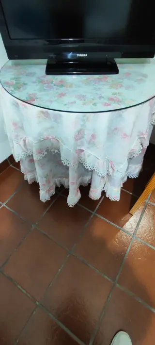 Mesa camilla redonda con enaguas y cristal. - Enaguas de tela en color rosa. -Cristal en perfecto estado