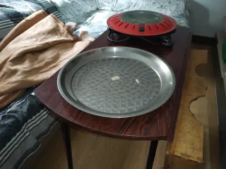 Mesa camilla de forma redonda con un diámetro de 80 cm. - Patas metálicas plateadas. Bastante usada pero con la ropa camilla no se ve, de ahí su precio io