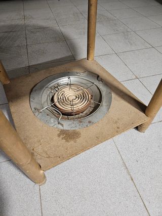 Mesa camilla redonda con estufa integrada. Alto 76 cm ancho 80 cm. - Tablero de madera cubierto con cristal. - Patas de madera. - Estructura metálica para la estufa.