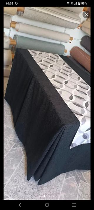 Ropa de mesa camilla de invierno en color negro , en medida de 1,50x0,90x0,74 de alto final , con 6 fuelles y camino, NO el de la primera foto , camino en el estampado de la segunda foto y dos fundas de cojines compañeras al camino en medida de 45x45 con cremallera invisible
