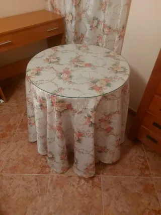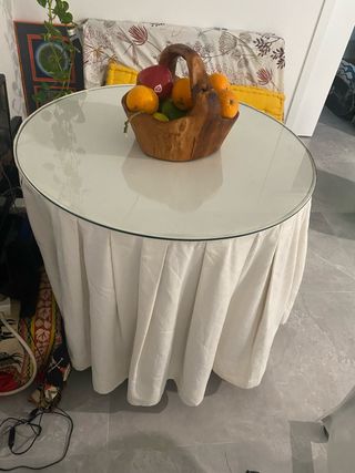 Mesa camilla con tapa de vidrio y faldas de textil, medias: altura 54 cm, diámetro 50 cm. Mesa 20€ vidrio 20€ faldillas 20€ todo junto: 45€. Para recoger en Murcia Capital