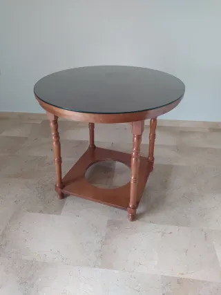 Mesa camilla de forma redonda con un diseño clásico. - Tablero de corcho. - Patas de madera torneada. - Base cuadrada con hueco central. - Una de ellas incluye cristal - La pequeña necesita reforzar estructura (PRECIO POR AMBAS, SE VENDEN JUNTAS)
