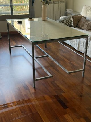 Mesa comedor o centro 140x100. Tiene dos alturas y dispone de tabla para colocar bajo el cristal por si se quiere hacer camilla para brasero. Comiendo caben perfectamente 6 personas. Las patas se quitan y para hacerla baja y se cierran con unos remates a modo de tapon de plástico. Ikea, Banak, Corte Ingles, Sklum, Jysk, Maisons du Monde, Zara Home, H&M Home, Westwing, Conforama, Muebles Boom, Kenay Home, La Oca, Leroy Merlin, Kave Home, El Corte Inglés Home, Casa, Made.com, Mobelium, Tikamoon